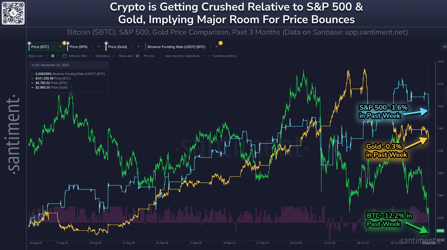 When the S&P 500 shows resilience (declining just -1.6% in the past week), it often signals that investors are still willing to take on some level of risk, which eventually spills into crypto. Conversely, when stocks decline sharply, Bitcoin tends to follow as traders de-risk across all speculative assets. And for now, a strong sign for patient cryptocurrency holders is the fact that equities (and even gold) are maintaining their levels well.