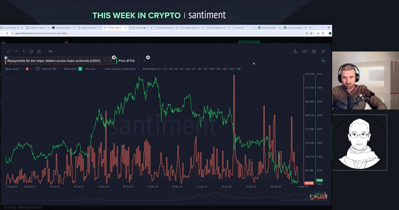 Looking at liquidation data across protocols, Maksim points to significant liquidations in late February and early March. "This is a bottom sign," he suggests, noting that previous instances of heavy liquidations were followed by market bottoms within two weeks. Combined with repayments in stablecoins and decreased borrowing activity across platforms, these metrics create conditions typically associated with market bottoms. While maintaining his long-term bearish outlook, Maksim acknowledges that near-term relief rallies are possible based on these technical indicators.