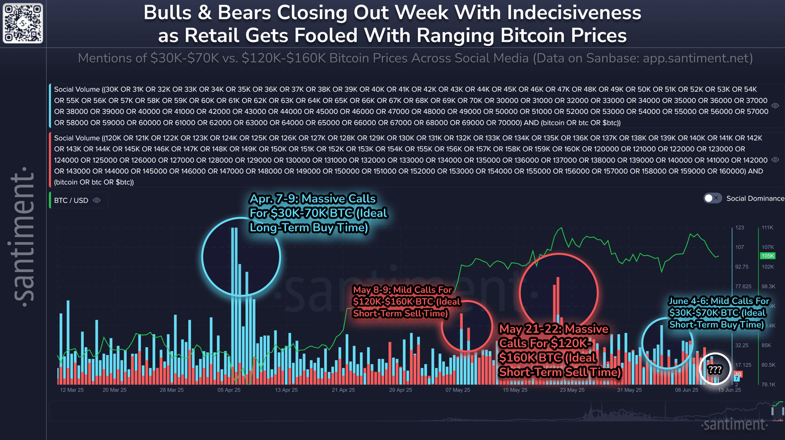 This is why this chart is so effective. It reflects the predictions of lower vs. higher prices across X, Reddit, Telegram, 4Chan, BitcoinTalk, and Farcaster. And since markets move the opposite direction of the way the conversations from retail are flowing, these calls can be used as an effective counter indicator.