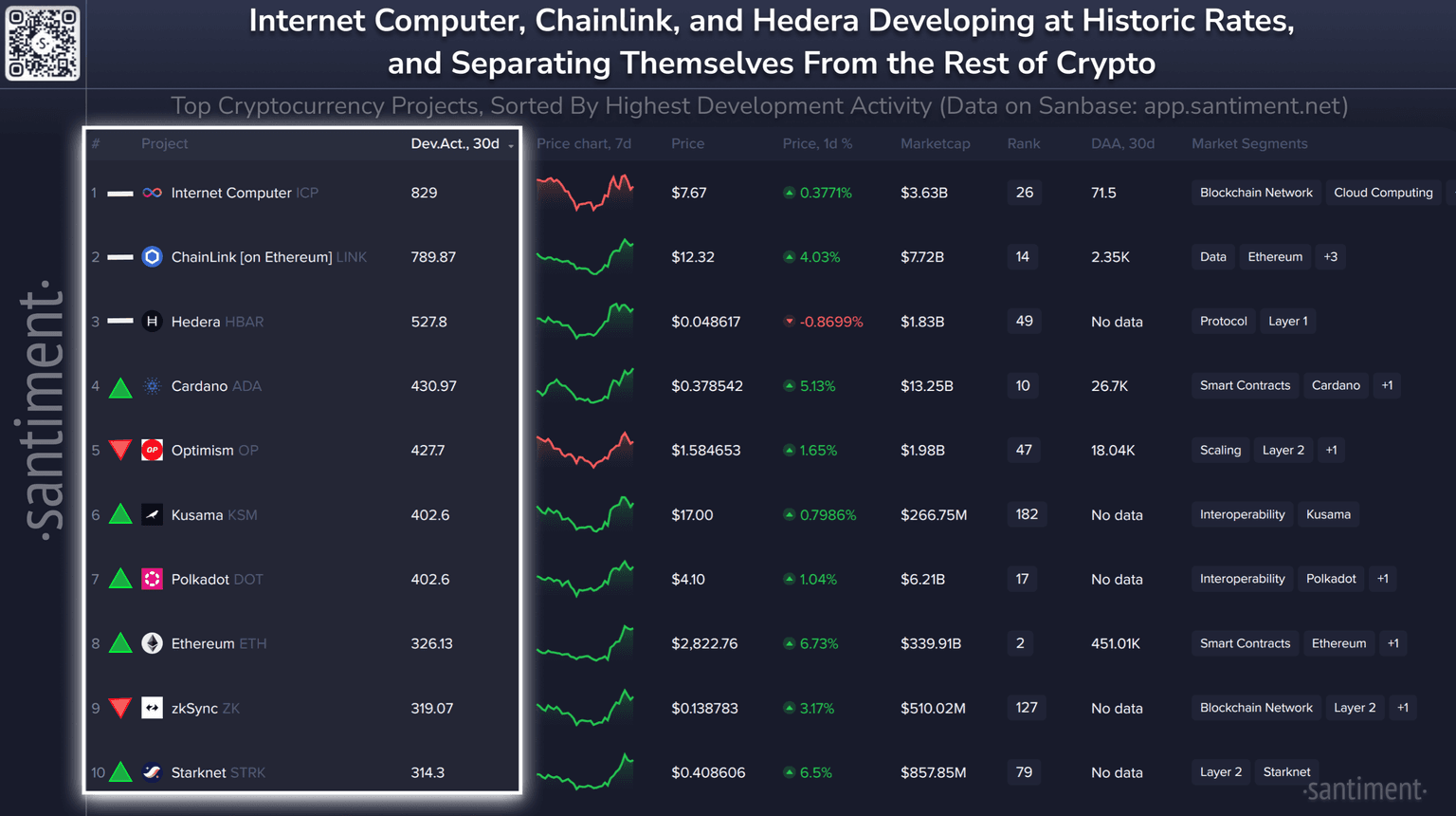 ๐งโ๐ป Here are crypto's top overall coins by notable development activity the past 30 days. Directional indicators represent each project's ranking rise or fall