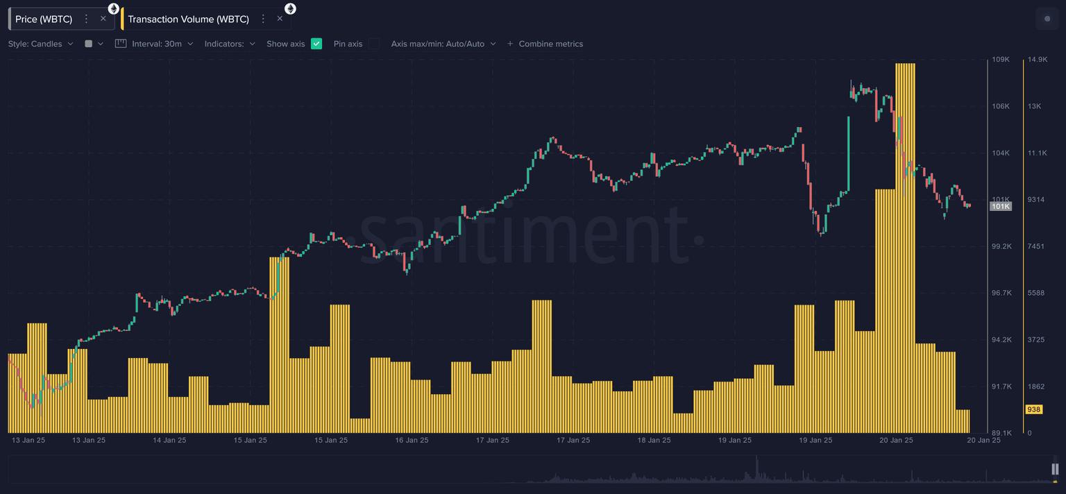 This is a whopping 0.75% of the entire supply moving to Kraken. It's worth noting that this was one of many other WBTC deposits that were all sent to either Kraken or Binance. None were as large as this one, but we can see the bunches of transaction volume spikes as crypto corrected. Since Wrapped Bitcoin is directly linked to Bitcoin's price, these may have been related to some of the big red candles we saw shortly after BTC's $109.3K all-time high.