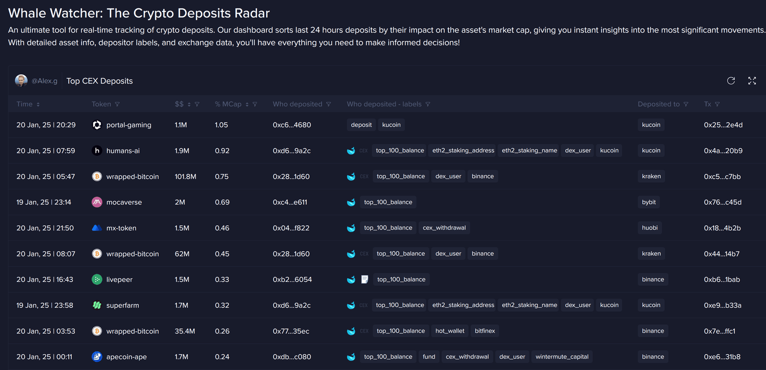This dashboard helps short-term traders and long-term investors spot upcoming big movements in the crypto market by showing large deposits made to major centralized exchanges. It displays important details like: