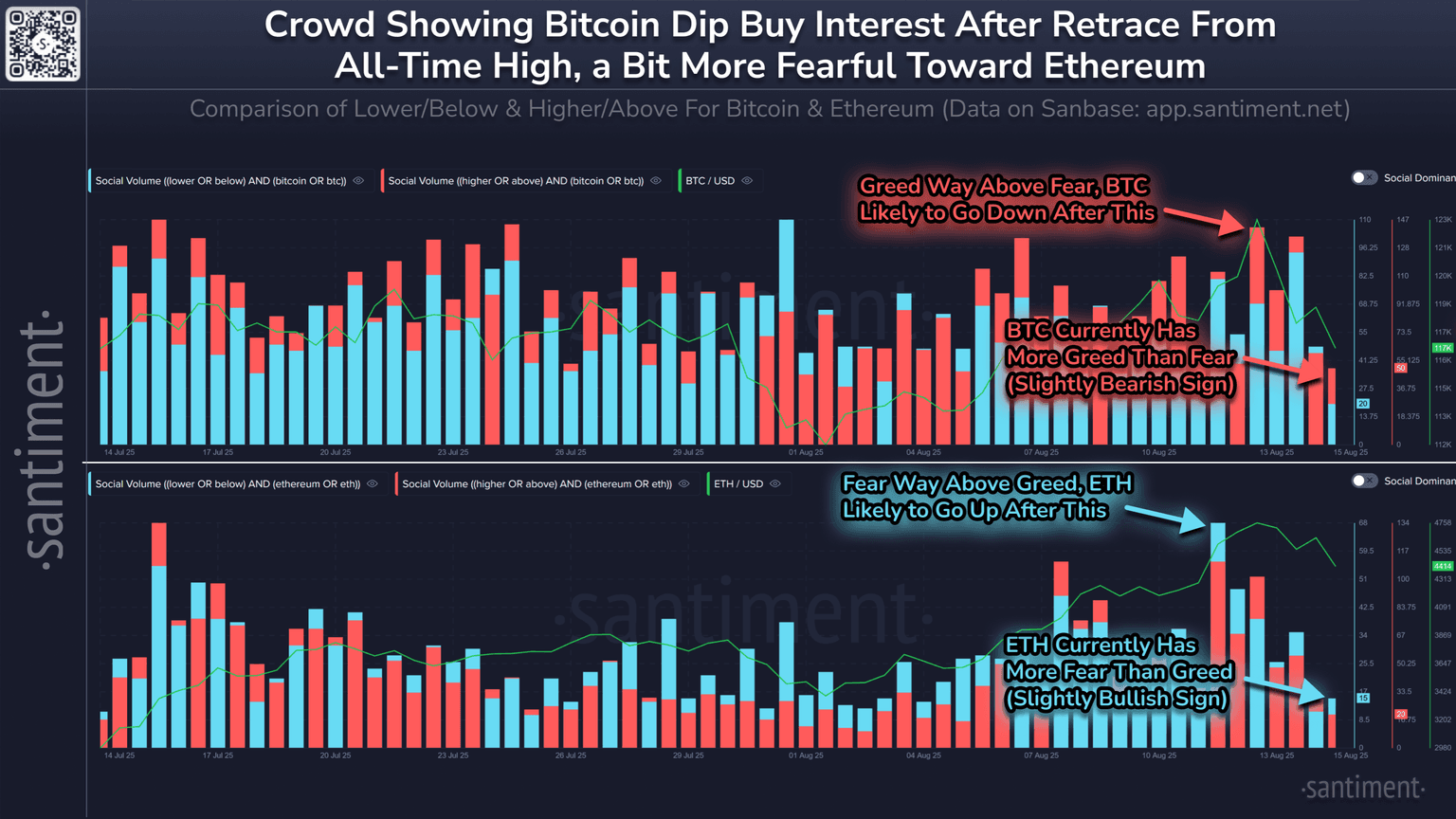 ππ Here are the mentions of 'lower' or 'below' and 'higher' or 'above' in relation to Bitcoin's & Ethereum's price levels. We can see that the greed spike on ETH crowd hasn't shown nearly as much bullishness despite significantly better performance over the past 3 months.