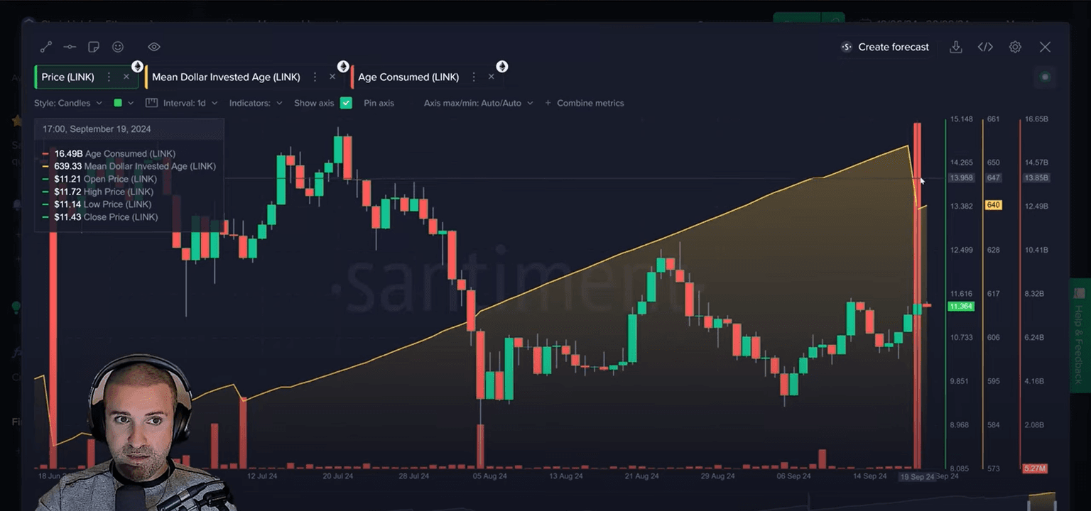 The live stream also covered altcoin activity, with Chainlink seeing a significant drop in mean dollar invested age, indicating that older addresses are moving their coins. This could be a bullish signal, as similar movements in the past have preceded price increases. Other notable mentions included USD Coin, which saw a large amount of coins moving off exchanges, and Maker, which is experiencing a surge in new wallet creations.