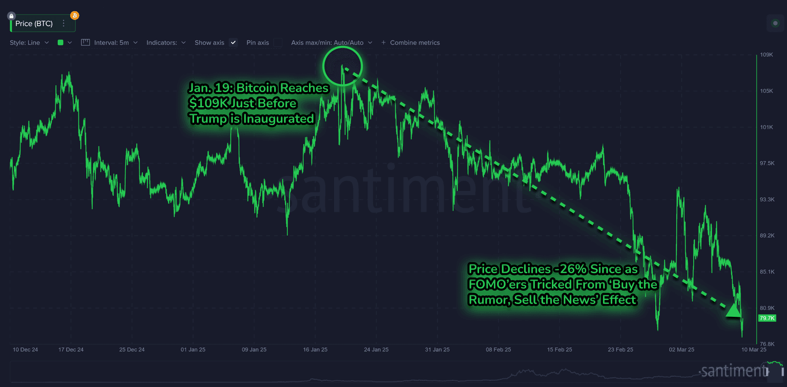 And as we can see above, when key stakeholders finally began to take profit on February 19, 2025, prices immediately began to see much steeper drop-offs. It is especially interesting to see that prices have continued to plummet (falling back to a low of $78K today) even after these high capital BTC wallets began to buy back in one week ago on March 3, 2025.
