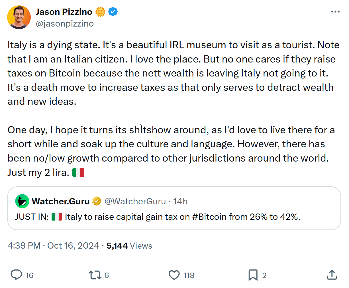 Even prominent figures within the crypto community, like Jason Pizzino, have voiced their concerns. Pizzino, an Italian citizen and well-known investor, called Italy "a dying state" in response to the news. He argued that the tax hike will further accelerate the flight of wealth from Italy rather than attract new investments. "It's a death move to increase taxes as that only serves to detract wealth and new ideas," Pizzino said, expressing the views of many who see this policy as shortsighted.