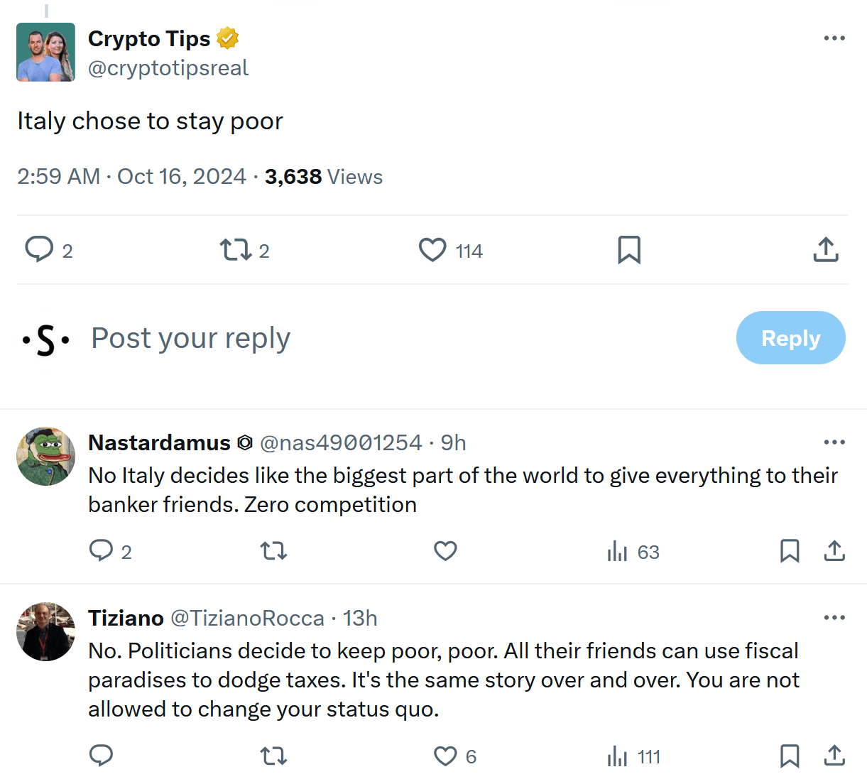 @cryptotipsreal on X summarized the prevailing sentiment, tweeting, "Italy chose to stay poor," in reference to the heavy tax burden on Bitcoin earnings. Others chimed in, pointing to the broader issue of wealth inequality, suggesting that this new policy will do little but drive the wealthy away from Italy, leaving behind a populace burdened by high taxes and slow economic growth.