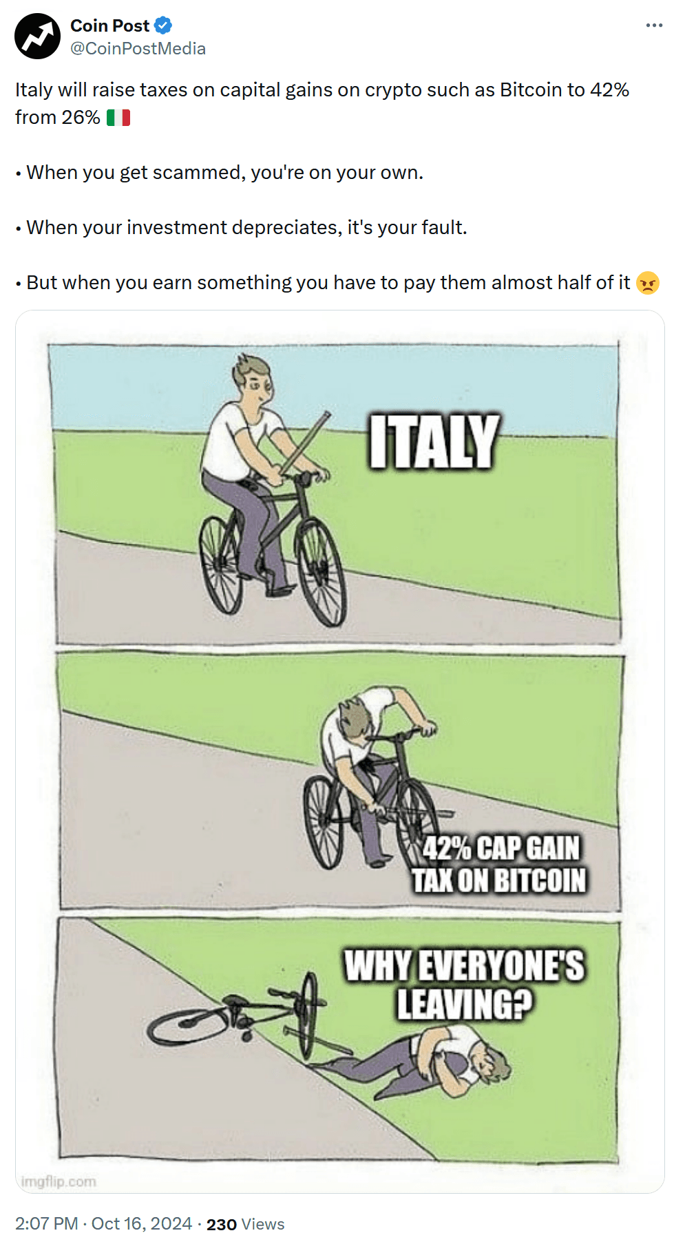 Italy's proposed increase in capital gains tax on Bitcoin, from 26% to 42%, has rattled the local cryptocurrency community and sparked a wave of bearish sentime