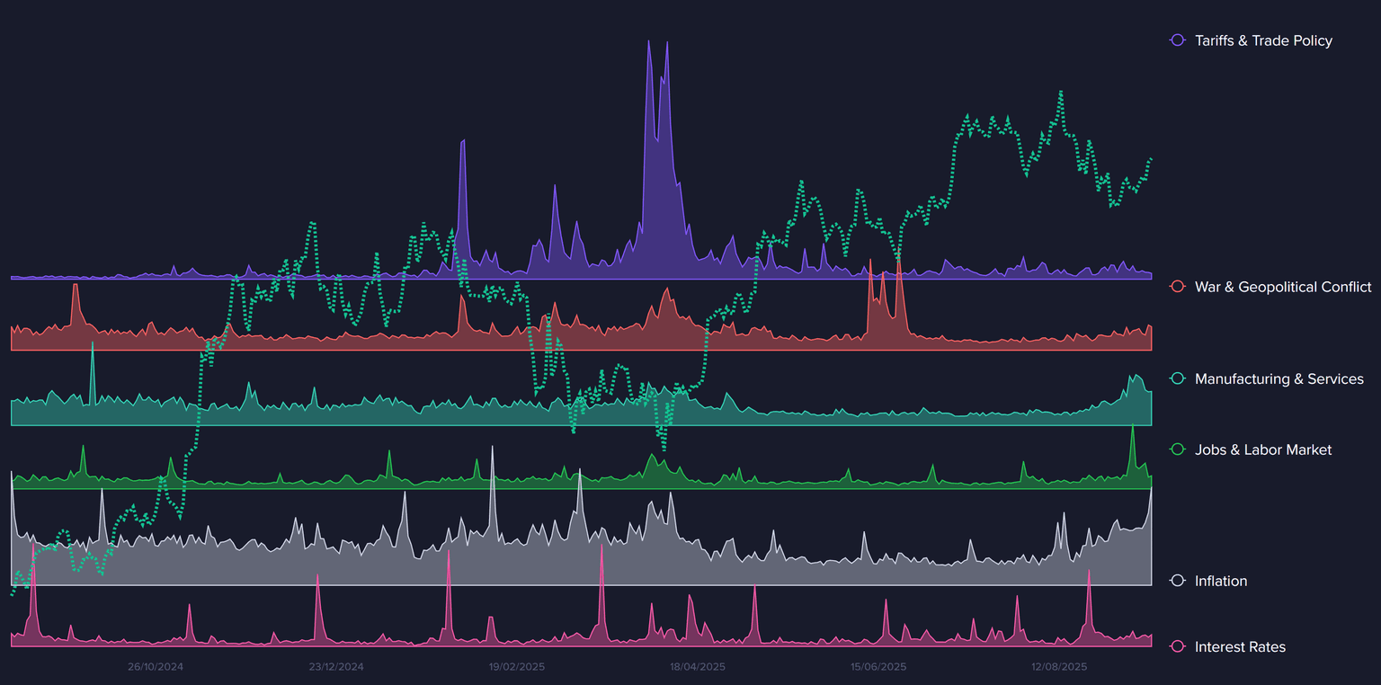 Each topic in the below chart is a frequently discussed economic topic. You'll see subjects like 'Tariffs & Trade Policy' or 'Inflation'. By identifying when these topics have outlier discussion rates on platforms like X, Reddit, and Telegram, you can see when traders are entrenched on a given story that is changing their perception about economic conditions. When spikes happen on one of these toipcs, it usually means one has a strong chance of being a catalyst for sudden crypto market volatility: