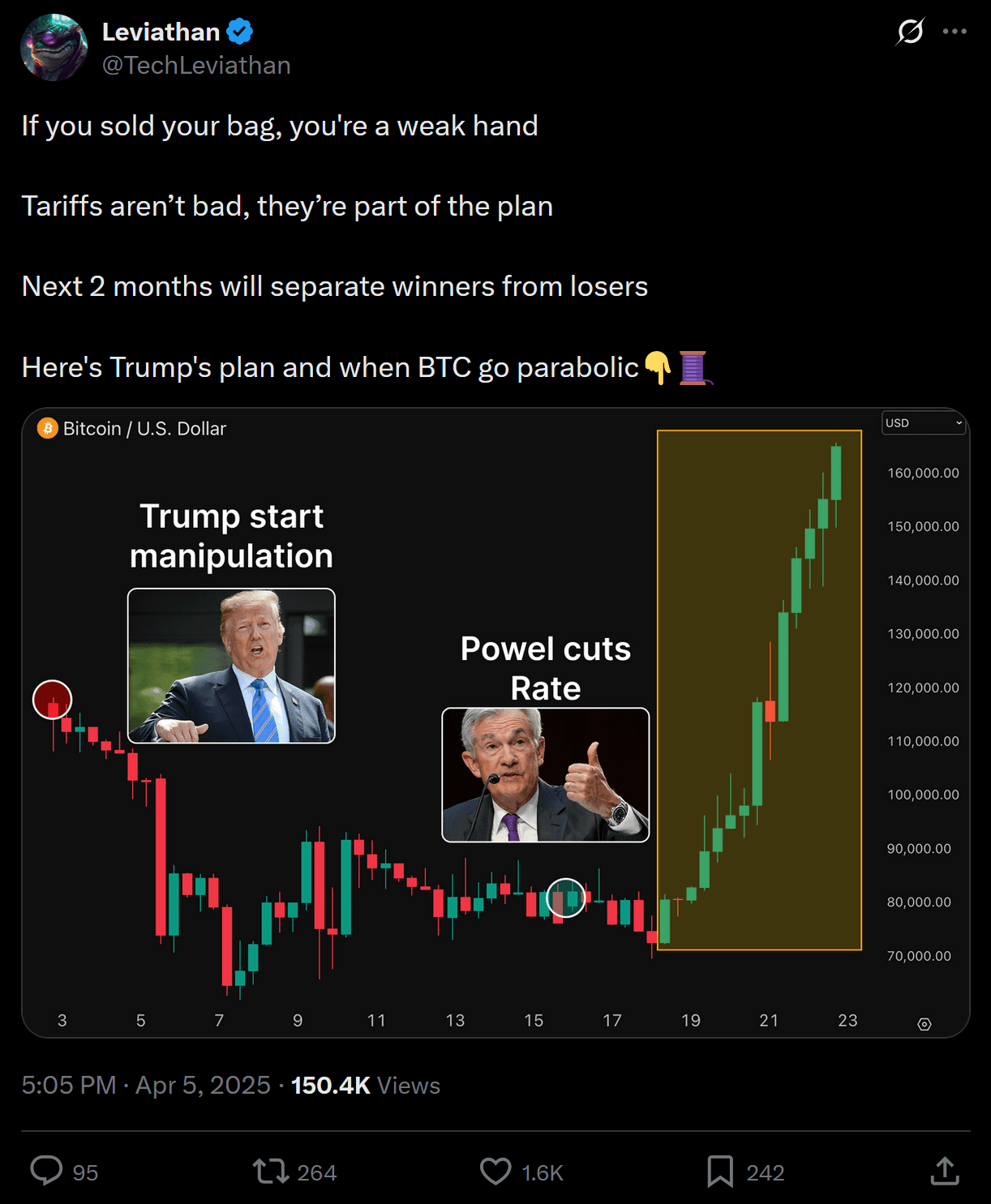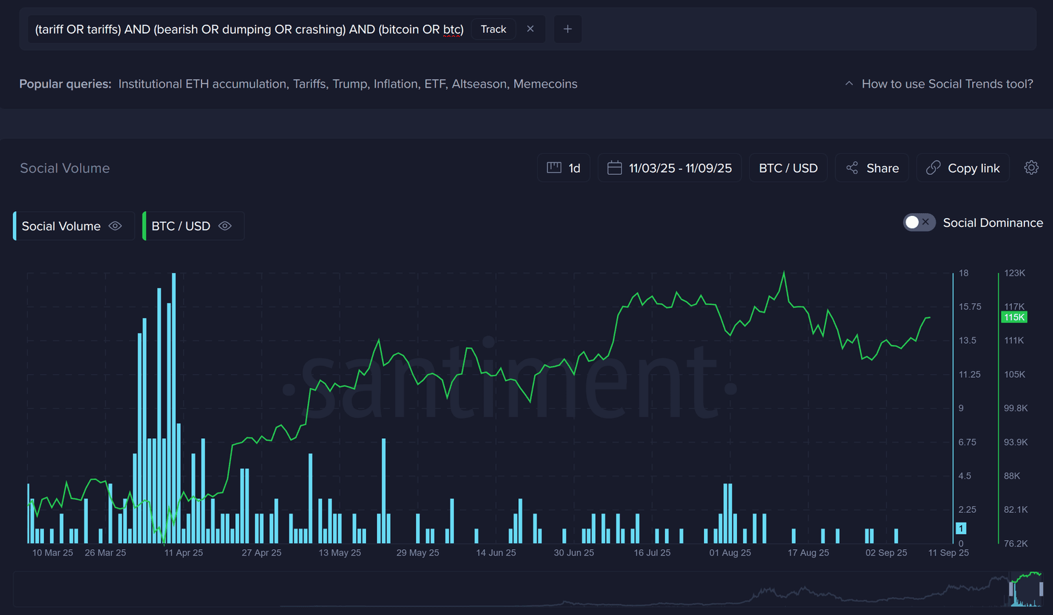 So what we can learn, taking a cursory look at these topics? Well, unsurprisingly, times of fear often create price bottoms. For example, when former president Donald Trump announced new tariffs in April 2025, mentions of trade duties and imports quickly spiked. Bitcoin dropped at the same time. Yes, tariffs were gradually put on pause throughout the next couple of months. But events like this often mark the end of a selloff because most small traders have already sold, leaving fewer sellers and allowing prices to bounce back. Take a look at how many traders were mentioning Bitcoin dumping or crashing alongside the topic of tariffs during the first two weeks of April, even after prices were already beginning to rebound. This panic simply fueled prices higher: