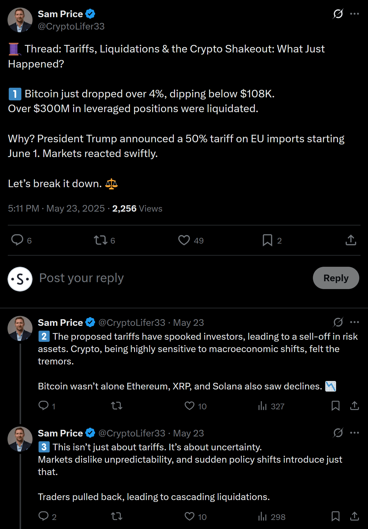 For crypto traders paying attention to broader narratives, this situation highlights how sensitive the space has become to traditional policy shifts. When tariffs are introduced or even threatened, they can signal inflation risk, supply chain disruptions, or a shift in consumer spending. These are all factors that affect both equity and crypto markets. Bitcoin may still be seen by some as a hedge against economic instability, but in practice, it often behaves more like a high-risk tech stock when headlines shake investor confidence.