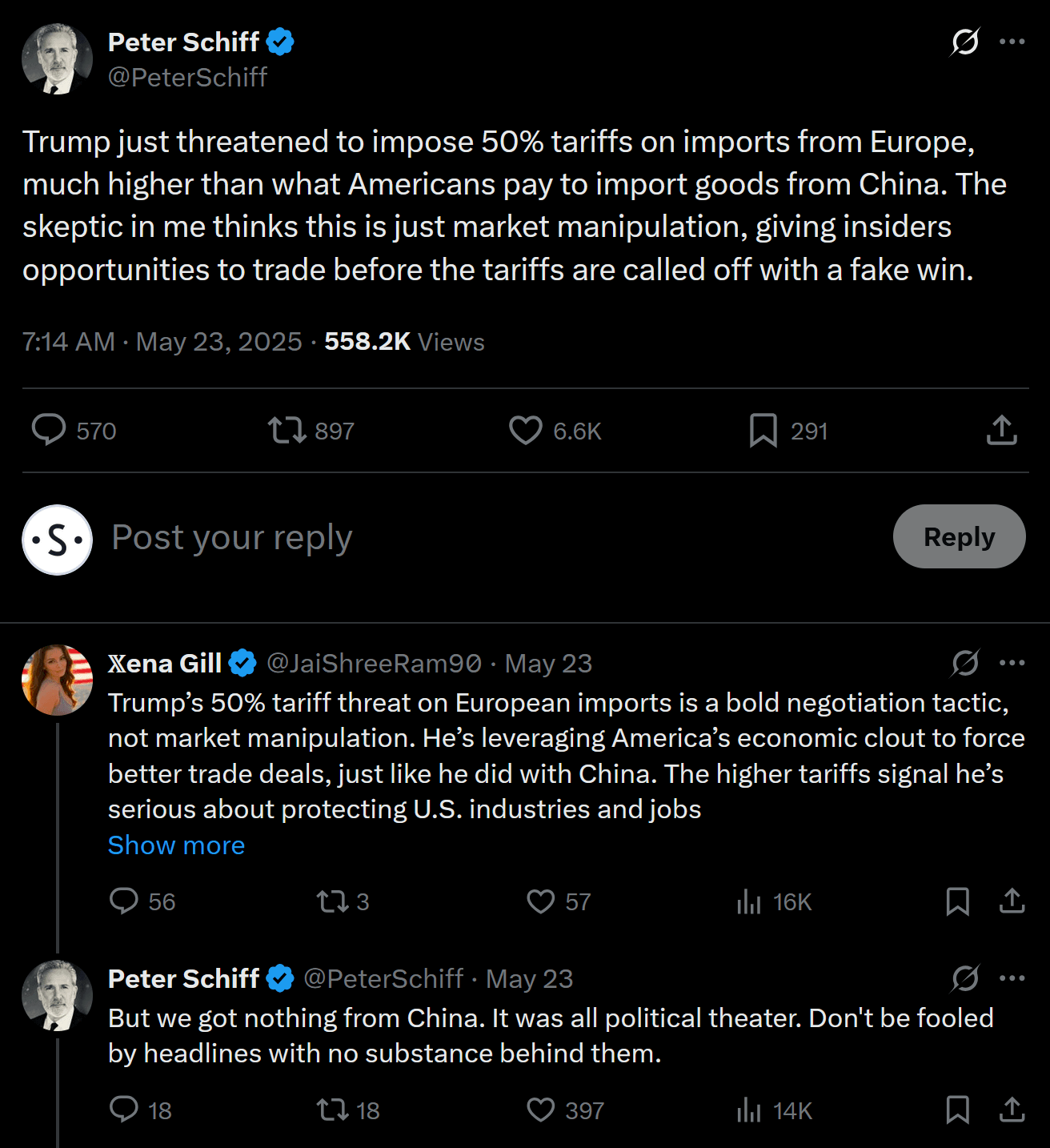 This kind of back-and-forth has become a familiar pattern for traders. Over the past seven weeks, Trumpโs trade war moves (whether they be negotiation tactics or complete bluffs) have often followed a similar rhythm: announce a threat, stir up headlines, then offer a short-term fix that avoids immediate conflict. While this approach can work as a negotiating tactic, it tends to keep markets on edge. For investors in crypto, where volatility is already baked into the landscape, this adds another layer of unpredictability. It's hard to deny that digital assets are way more intertwined with global macro trends than they were a decade ago, back when crypto felt like a true free-for-all. And many, like Peter Schiff, have been vocal about what they believe is actually going on: