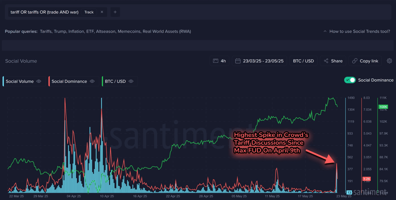 On Santiment, we saw how the major increase in tariff talks was correlating with the market-wide downswing. This was the biggest jump in the topic since the major capitulation (and perfect time to buy) occurred between April 7th and 9th.