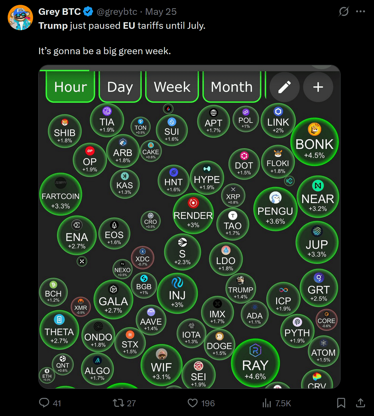 With Bitcoin holding steady and altcoins searching for direction, patience and perspective are key. As negotiations between the U.S. and seemingly everyone else unflod, cryptoโs response is probably going to be mirroring how stock traders are reacting as well. So expect them to stay in close correlation. They are similarly calm for now, but have the potential to shift quickly on any further news that could blindside the entire world at any time. The U.S. markets were on holiday for Memorial Day, but expect them to open in the green later today, marking a delayed reaction to Trump's pause just before markets closed on Friday. And that means crypto will likely see a slight boost as a result.