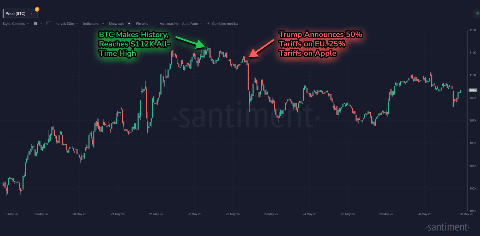 The cryptocurrency market has taken a slight breather ever since President Trump reignited (then paused) trade tensions with the European Union. After a new Bitcoin all-time high of $112K was briefly celebrated, Bitcoin and most altcoins have moved sideways, giving back some of their gains in response to the uncertainty. Trumpโs unexpected announcement of a 50% tariff on EU goods, followed by a quick pause (two days later) until July 9th, has left traders second-guessing the near-term direction of markets.