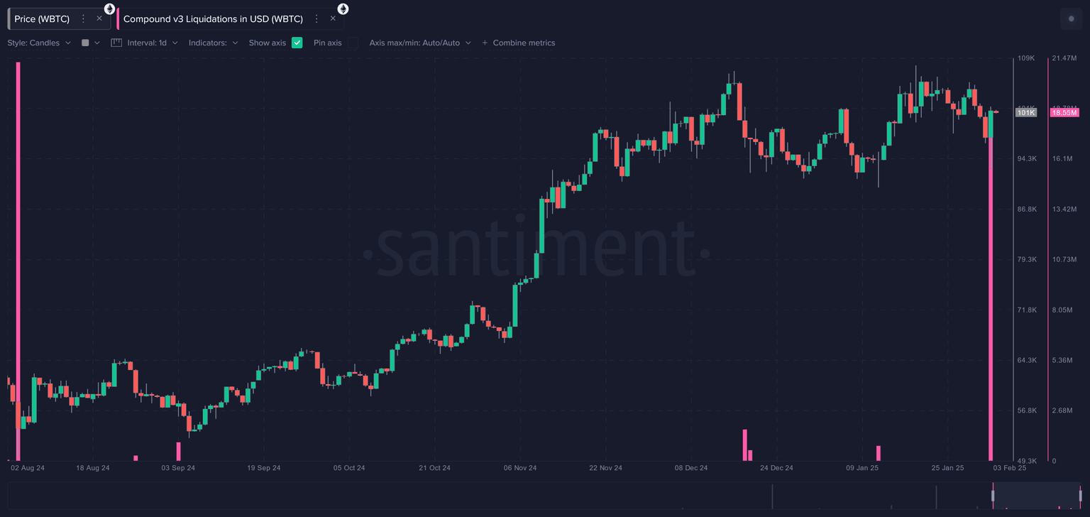 Compound V3 is the latest version of the decentralized lending protocol, designed to improve capital efficiency and reduce borrowing risks. It just recorded its highest Wrapped Bitcoin (WBTC) liquidation day since August 4, 2024, totaling $18,559,189. Borrowers use WBTC as collateral to take out loans, while lenders supply liquidity and earn interest. This version introduced a single borrowing asset model, enhanced risk controls, and more efficient liquidation mechanisms, making it easier to manage loans while reducing systemic risk. However, when WBTC's price drops significantly, borrowers who fail to maintain enough collateral face forced liquidations, leading to large-scale sell-offs.