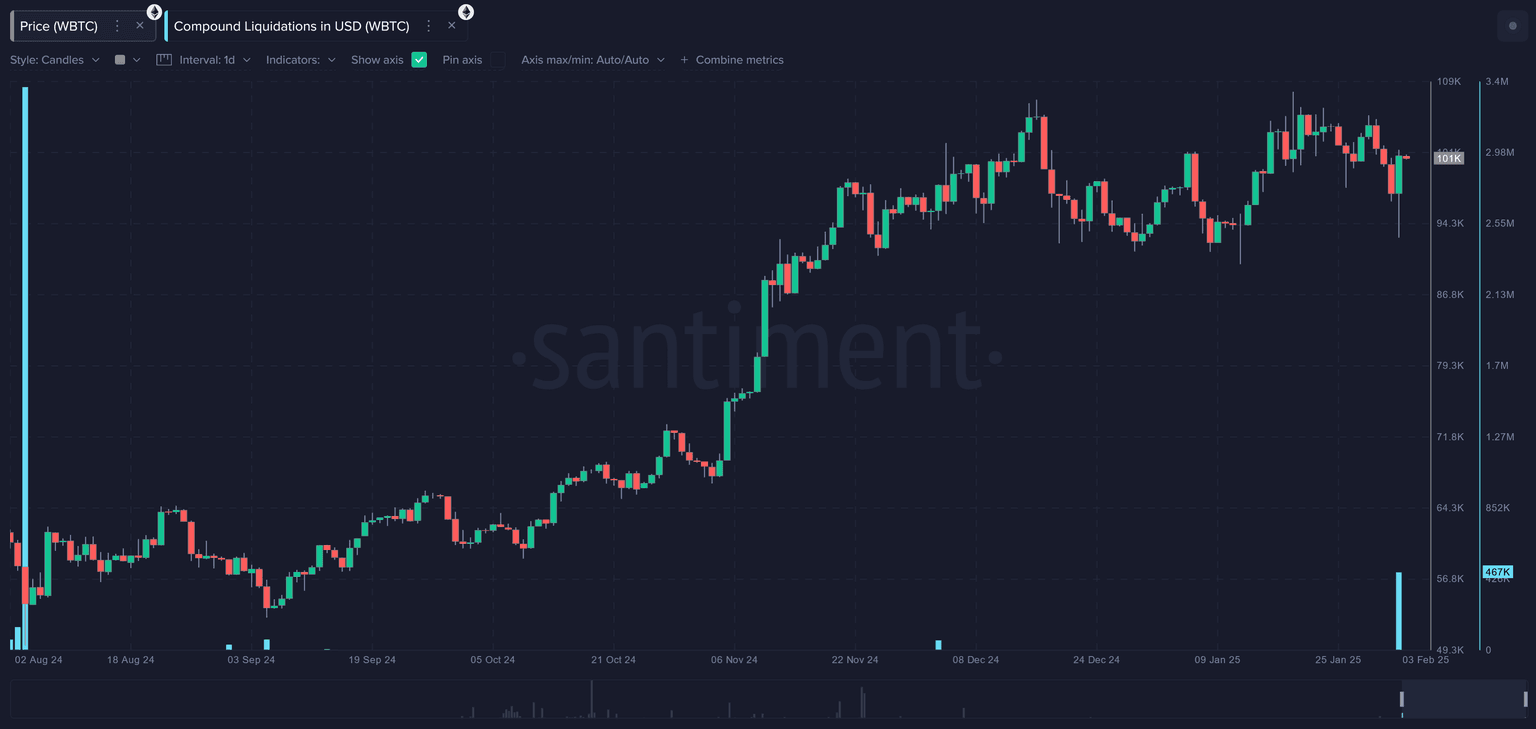 Compound is a decentralized lending protocol that allows users to borrow and lend cryptocurrencies while earning interest on their deposits. It just experienced its highest Wrapped Bitcoin (WBTC) liquidation day since August 4, 2024, totaling $467,284. Borrowers use WBTC as collateral to secure loans, while lenders provide liquidity to earn passive income. This version of Compound enables automated interest rate adjustments and efficient capital allocation, but when the value of WBTC drops too much, borrowers risk liquidation, triggering forced sell-offs to cover outstanding loans.