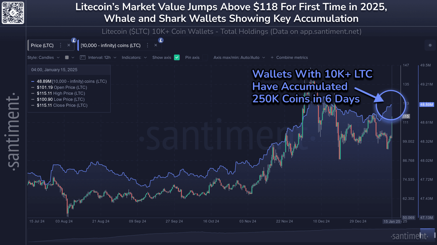 β‘οΈπ Litecoin has decoupled from other altcoins, jumping +16.1% in market cap in just the past 11 hours. Just as we saw in early December, the key driver appears to be whales and sharks holding at least 10K+ $LTC. They have accumulated 250K coins since Jan. 9th. π