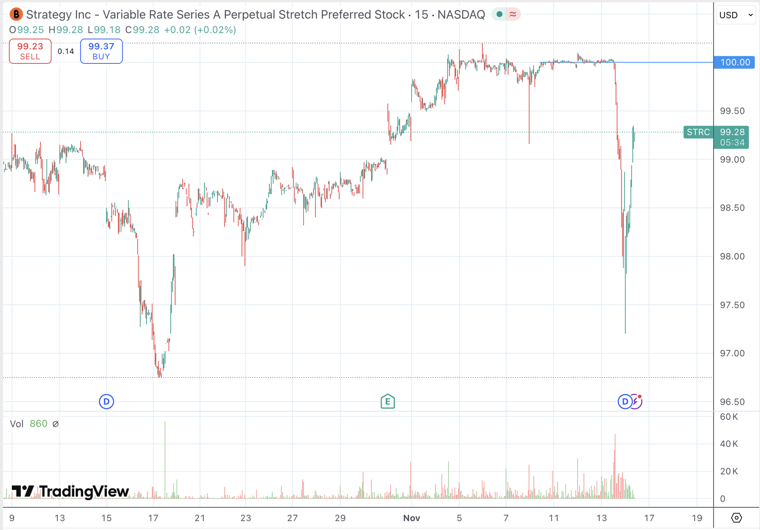 Another thing worth noting is that STRC depegged quite severely yesterday before market close, and hasn't recovered as of yet. That might potentially indicate that 1) there was a big buyer that finished purchasing, or 2) investors started pricing in some additional risks that weren't present before.