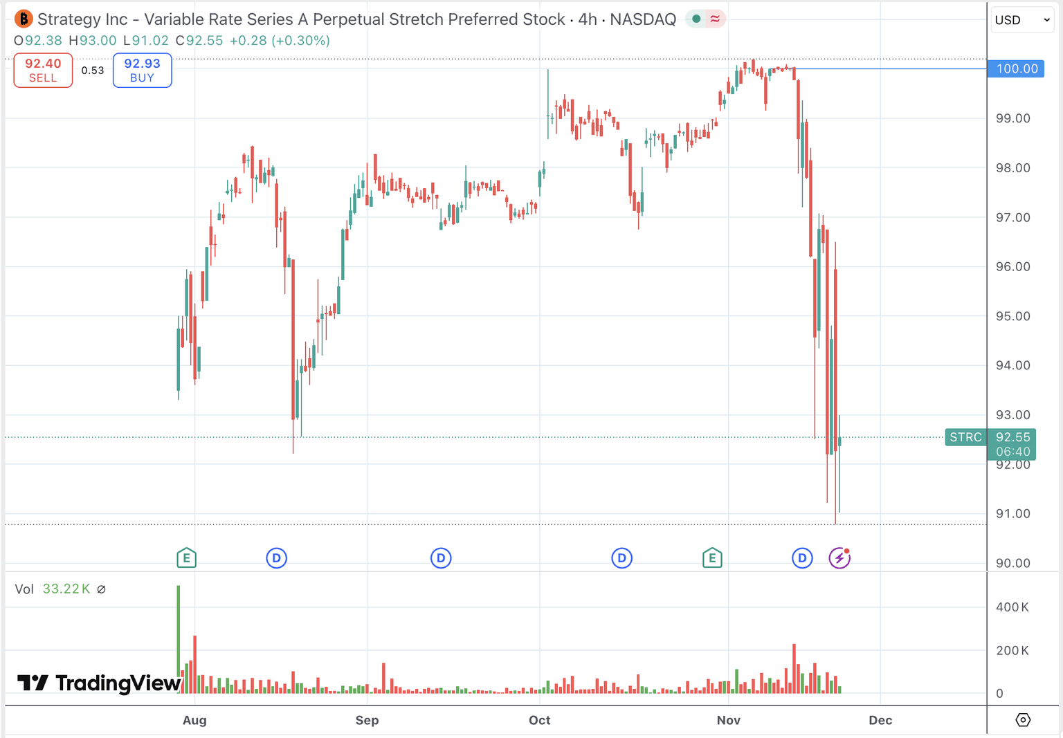 Saylor's poster child preferred stock STRC depegged even more, trading between 93 today, which likely doesn't inspire much confidence in investors who were promised a "$100 bill paying 10% yield".