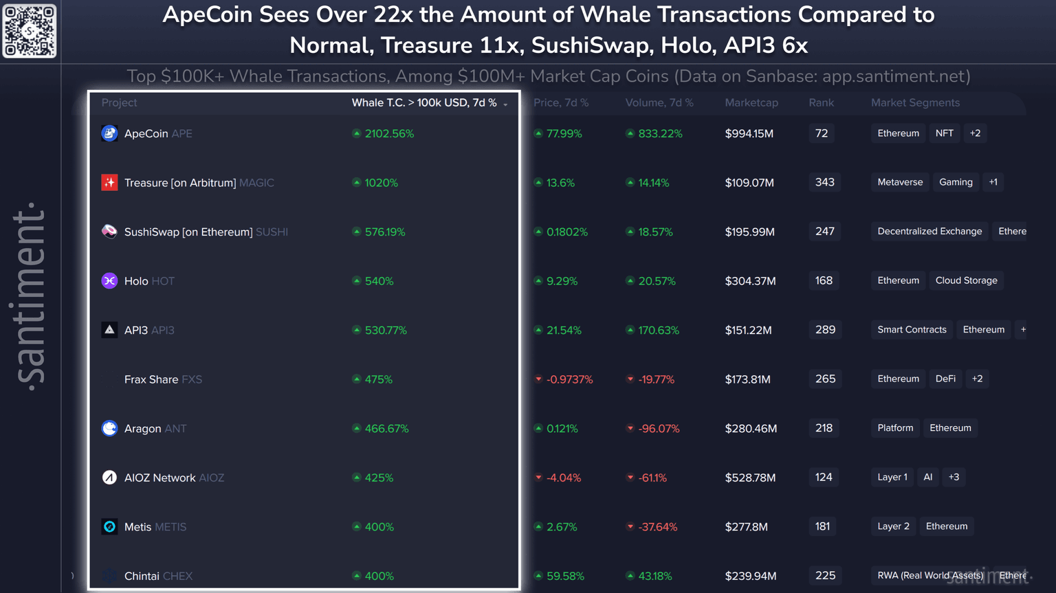 π³ These coins have seen the biggest whale activity increases over the past week: 1) Apecoin $APE 2) Treasure $MAGIC 3) Sushiswap $SUSHI 4) Holo $HOT 5) API3 AP