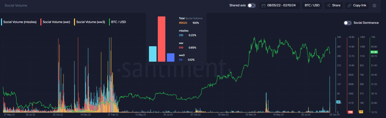 missiles, war, WW3 Social Trends The chart shows the link between conflict-related terms (missiles, war, WW3) and Bitcoinโs price. Social spikes, especially fro