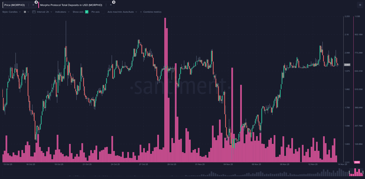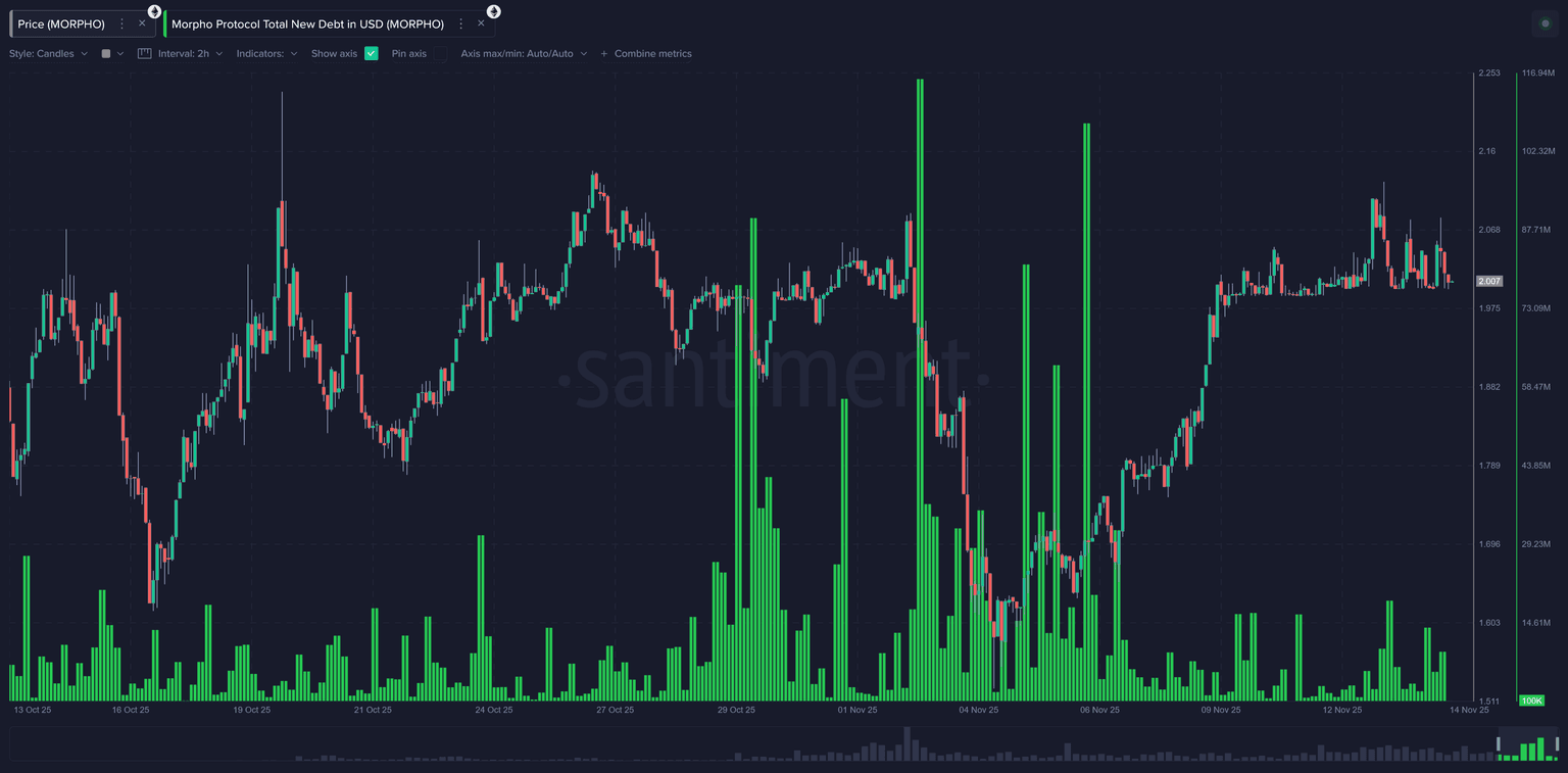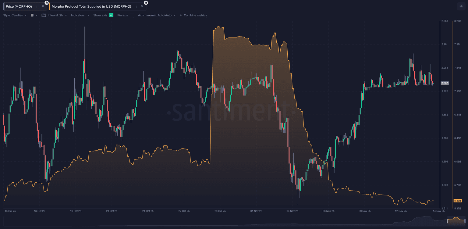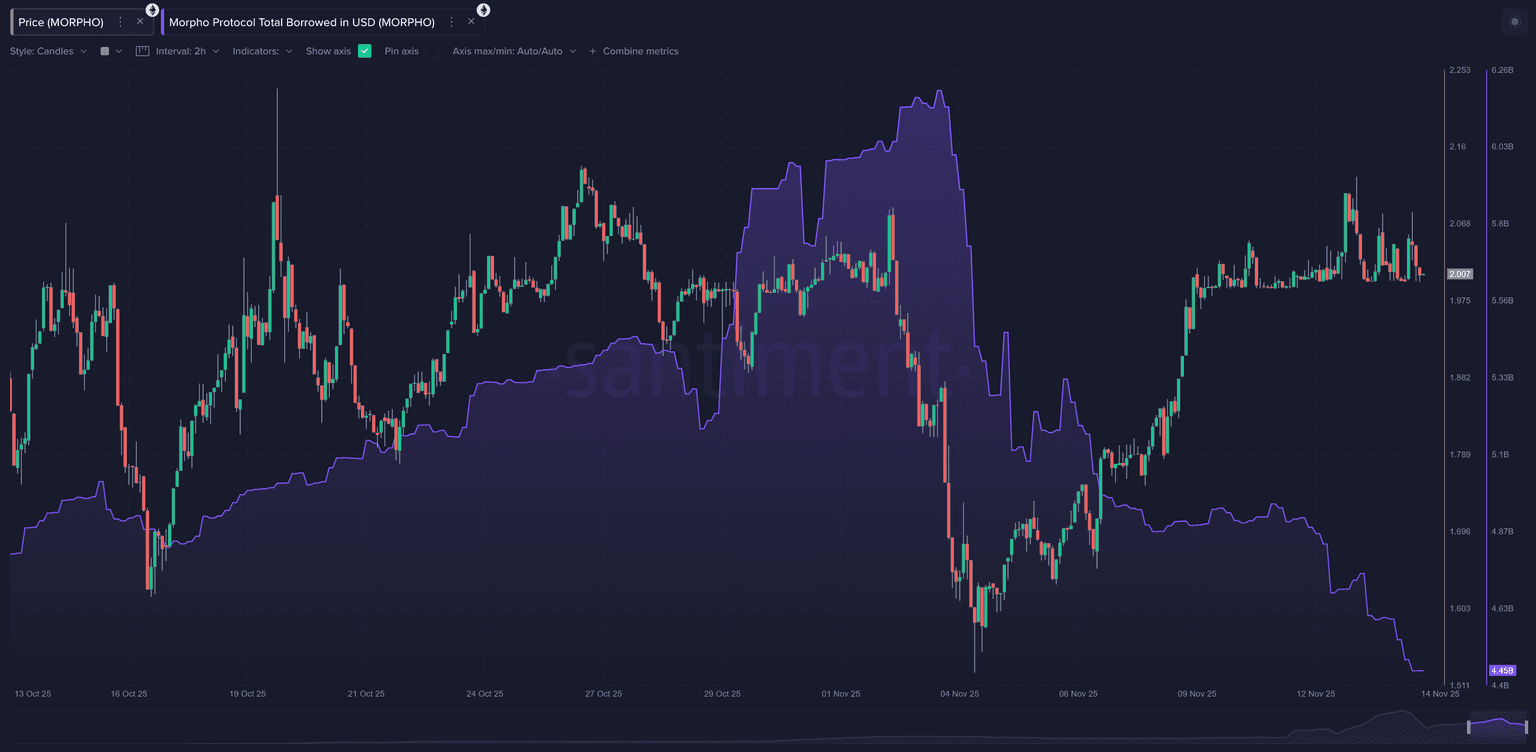 This shows the total amount that users have borrowed on Morpho , expressed in USD across all assets. It rises when users are willing to take on leverage or borrow stablecoins to deploy elsewhere. A growing borrowed amount may indicate bullish risk-taking or strong demand for liquidity. A falling amount can signal deleveraging, increased caution, or expensive interest rates. Traders often compare borrowing trends to price movement to understand risk appetite.