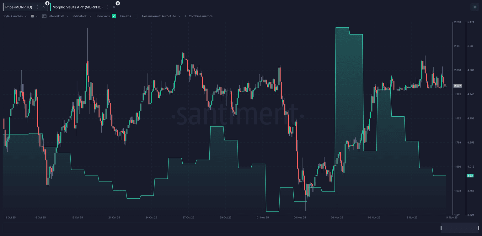 This metric shows the annual percentage yield (APY) that Morpho Vault depositors currently earn. It reflects how much interest a user would receive over a year if the present yield stayed constant. APY is influenced by borrowing demand, market interest rates, and vault utilization. Rising APY often signals increased demand for borrowing or temporarily boosted rewards. Lower APY often reflects capital oversupply or reduced lending activity.