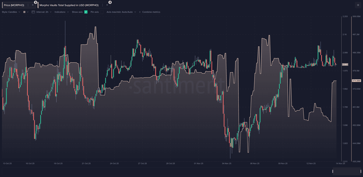 This metric measures the total value deposited into Morpho Vaults , converted to USD. It shows how much liquidity the Morpho Vault ecosystem has at any moment. Sudden increases usually indicate strong confidence from depositors or yield-seeking inflows. Drops may reflect withdrawals due to risk concerns, lower yield, or market volatility. It helps traders understand whether the vault system is attracting or losing capital.