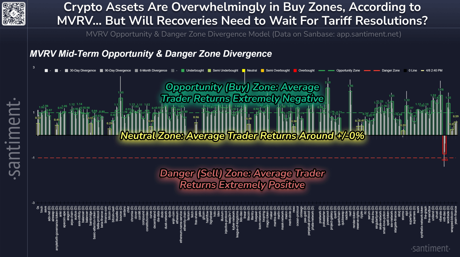 π Based on mid-term timeframes, average trading returns are now unsurprisingly showing 'Opportunity Zones' for the majority of altcoins. As tariffs have wreaked havoc on the crypto sector, the Santiment MVRV Divergence model shows that assets have racked up heavy enough realized losses to justify dip buys...