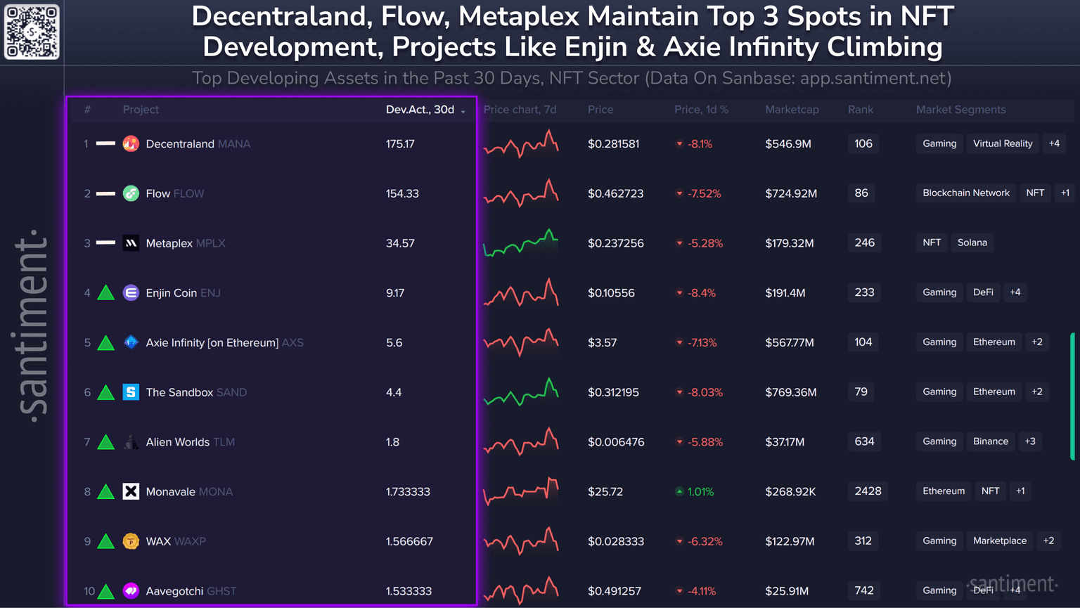 π§βπ» Here are crypto's top NFT projects by development. Directional indicators represent each project's ranking rise or fall since last month: 1) Decentraland