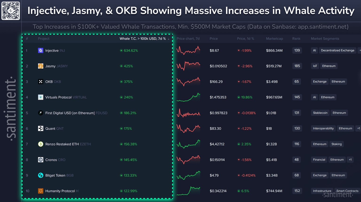 π Here are the projects seeing the highest week-over-week rises in their networks' whale transactions ($100K or more), among $500M+ market caps: π³ 1) Injectiv