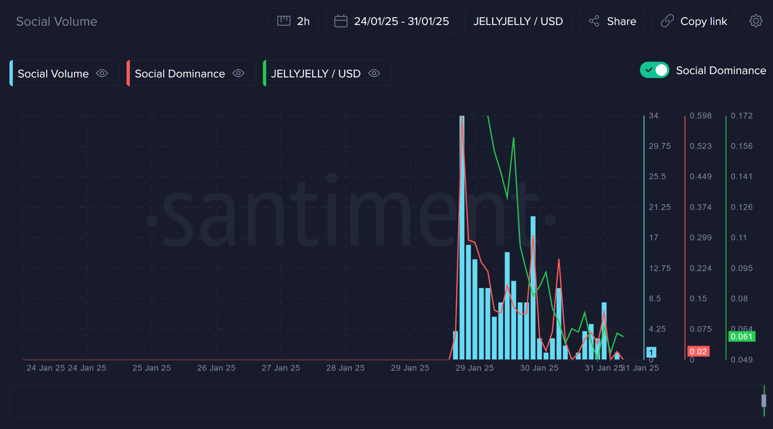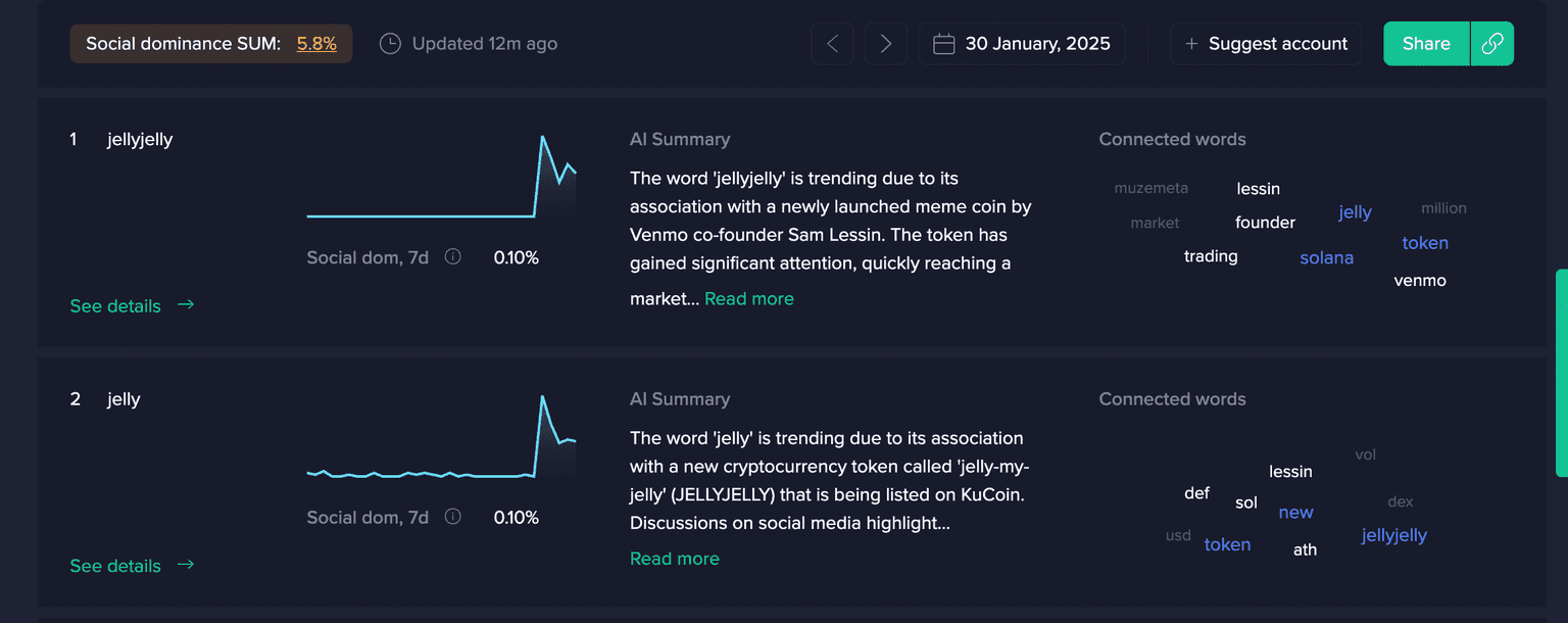 It's no secret that cryptocurrency markets are largely driven by hype, speculation, and social media trends. Recently, the meme coin JellyJelly has taken center stage, soaring in mentions across social media and landing atop Santiment's Top Trending Keywords Dashboard. But when the meme community's latest shilled coin starts trending, particularly in the very top spot on this dashboard, you may want to sit this one out...