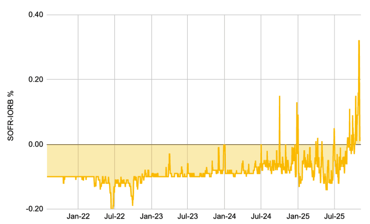 - 지표 1: 치솟는 SOFR-IORB 스프레드