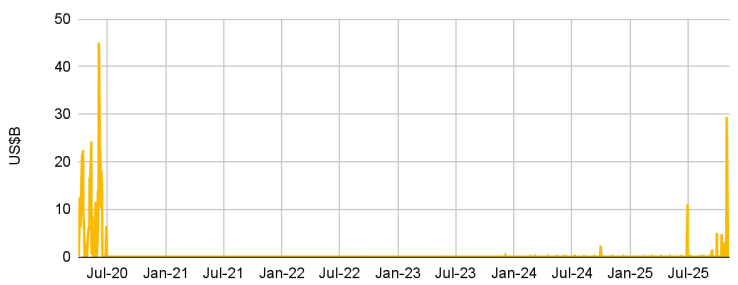 - 한때 2.5조 달러에 달하며 거대한 유동성 저수지 역할을 했던 RRP는 거의 고갈되어 잔고가 510억 달러로 떨어졌습니다. 동시에 은행들은 긴급 안전판에 의존해야 했습니다. SRF 사용량은 10월 31일 503.5억 달러로 사상 최고치를 기록했고, 11월 3일에도 147.5억 달러로 높은 수준을 유지했습니다. 이는 민간 자금 시장이 시스템의 유동성 수요를 충족시키지 못하고 있음을 의미합니다.