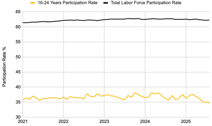 - 전체 노동참여율은 62.3%로 안정적으로 보이지만, 인구통계학적 세부 내용은 우려스럽습니다. 16-24세 연령층의 참여율은 올해 1.5% 하락했습니다. 이는 구직난이나 학업 연장 선호 등으로 인해 젊은 층의 고용 의욕이 저하되었음을 시사합니다.