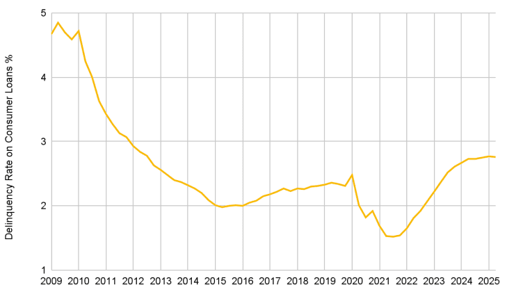 - 미국 상업은행의 소비자 대출 연체율은 2.76%로 2012년 이후 최고치를 기록했습니다.