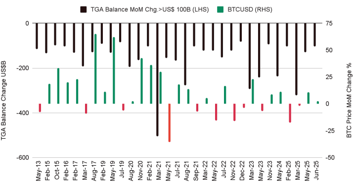 역사적으로 TGA 잔고가 800억 달러 이상 감소한 달에 비트코인 가격은 61%의 확률로 상승했으며, 평균 8.8%, 중앙값 2.7%의 수익률을 기록했습니다.