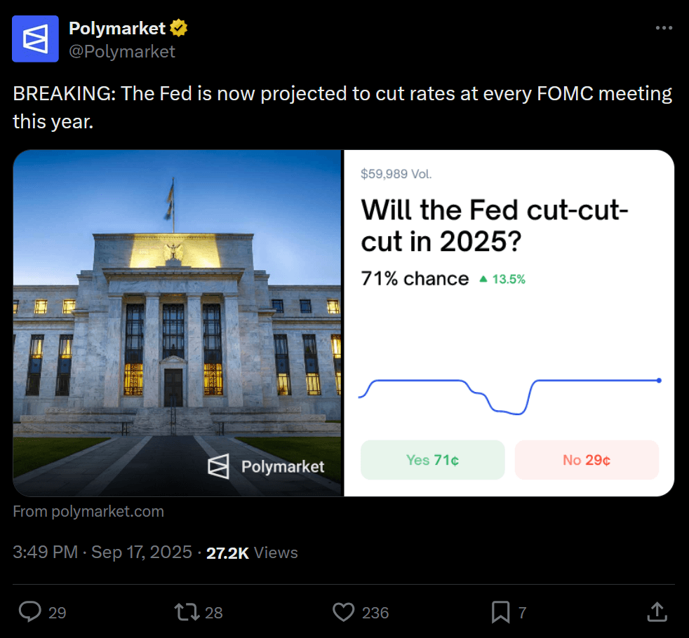 Bets are already being placed on Polymarket on how the results of the rest of the interest rate decisions will go. With two other FOMC meetings to go, the bets currently show a 71% expectation in both resulting in further cuts.