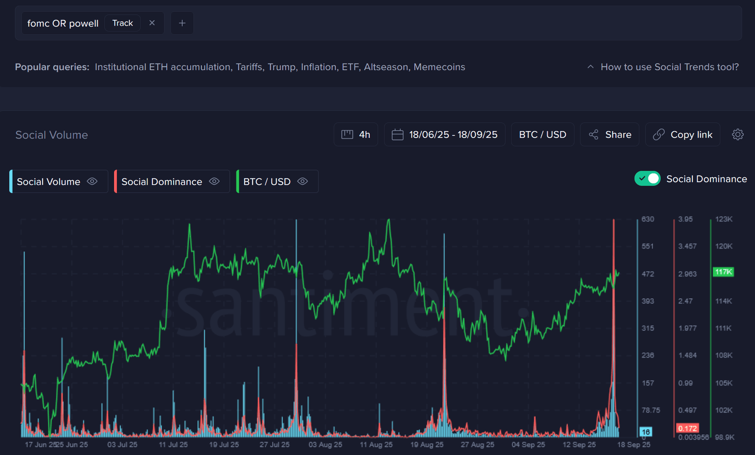 However, there was a huge social dominance spike that greatly eclipsed any other discussions about the FOMC or Powell. The last time we saw discussion rates of this size was in April, while tariffs were still the center of attention and Trump had anticipated a rate cut due to the massive market dips happening during that time.