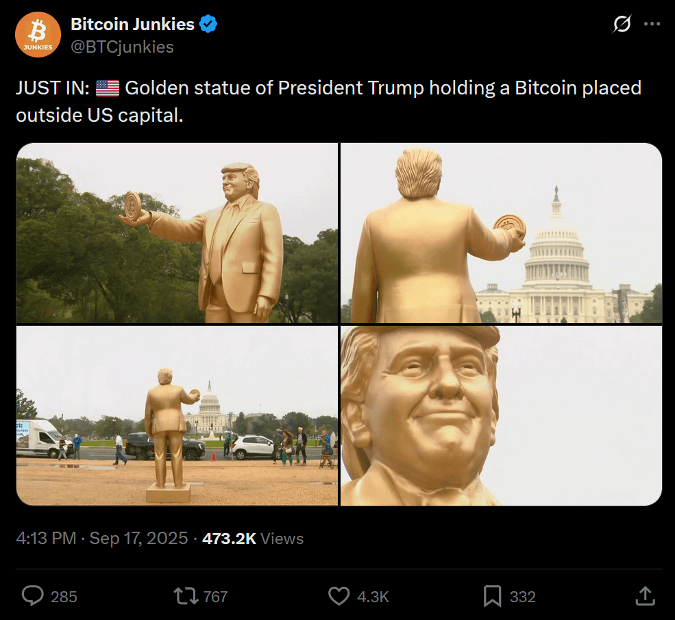 And yes, on a related note, there was a 12-foot golden statue of former President Donald Trump holding a Bitcoin, unveiled on the National Mall near the Capitol just before the decision. Some view this as a positive signal that one of the world's most powerful nations continues to push toward a pro-crypto, mass adoption society.