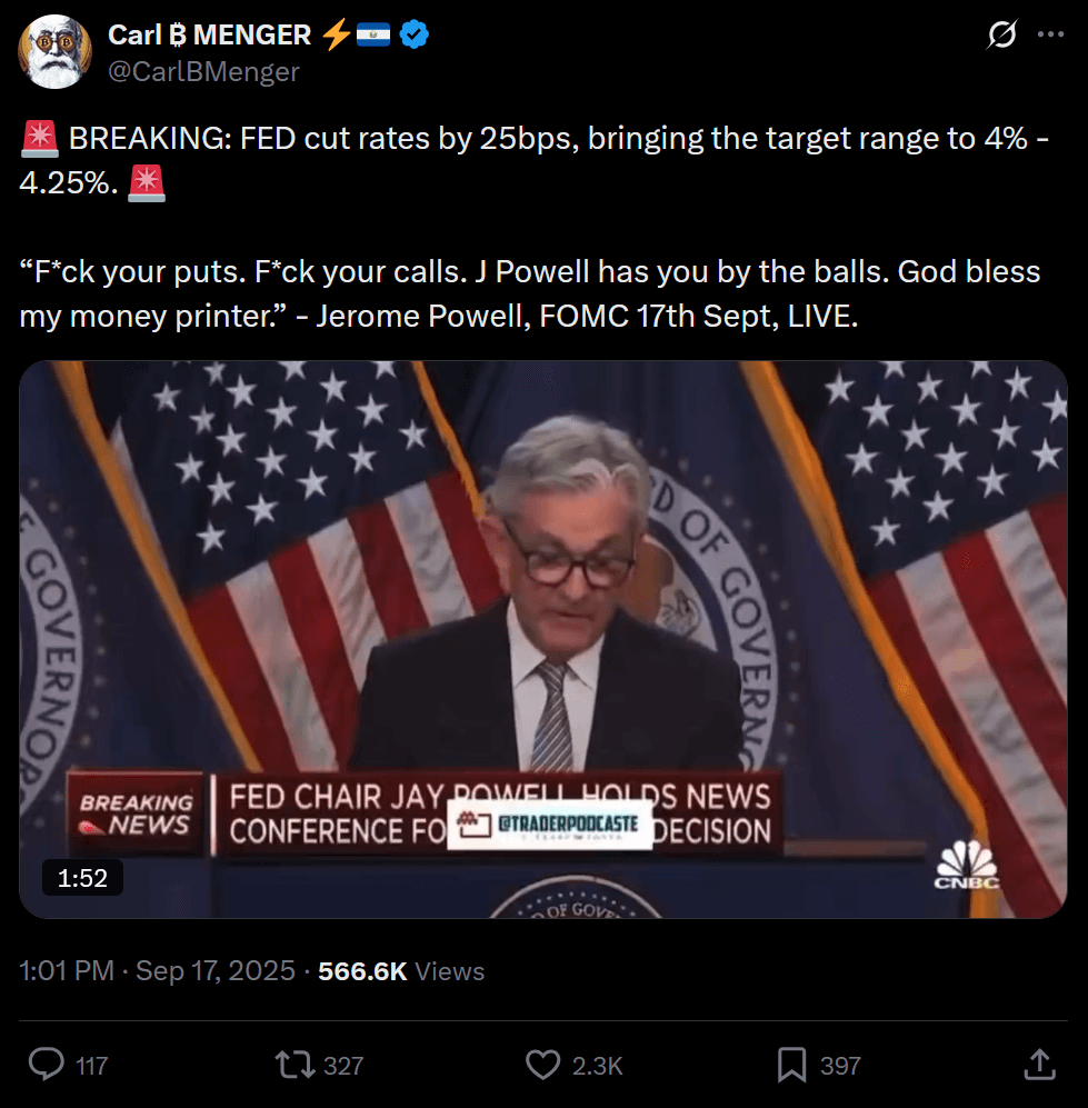 This statue has been rocketing around social feeds, garnering mixed reactions as expected. Pro-crypto traders seem to view it as a slightly bullish sign for crypto, or at least "not harmful". They generally see it as a wink toward mainstreaming and political momentum for digital assets, even though many critics saw it as pure meme-marketing. Either way, it really does symbolize how cultural and political theater now intersects with macro catalysts to shape crypto’s narrative on big Fed days.