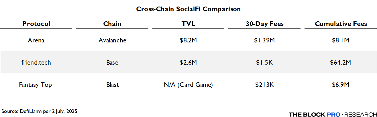 As for cross‑chain social‑fi comparisons, Arena’s TVL is currently 3x larger than friend.tech’s. Its 30-day trailing fees also significantly exceed those of both friend.tech and Fantasy Top, and its cumulative fees have already surpassed Fantasy Top’s as well.