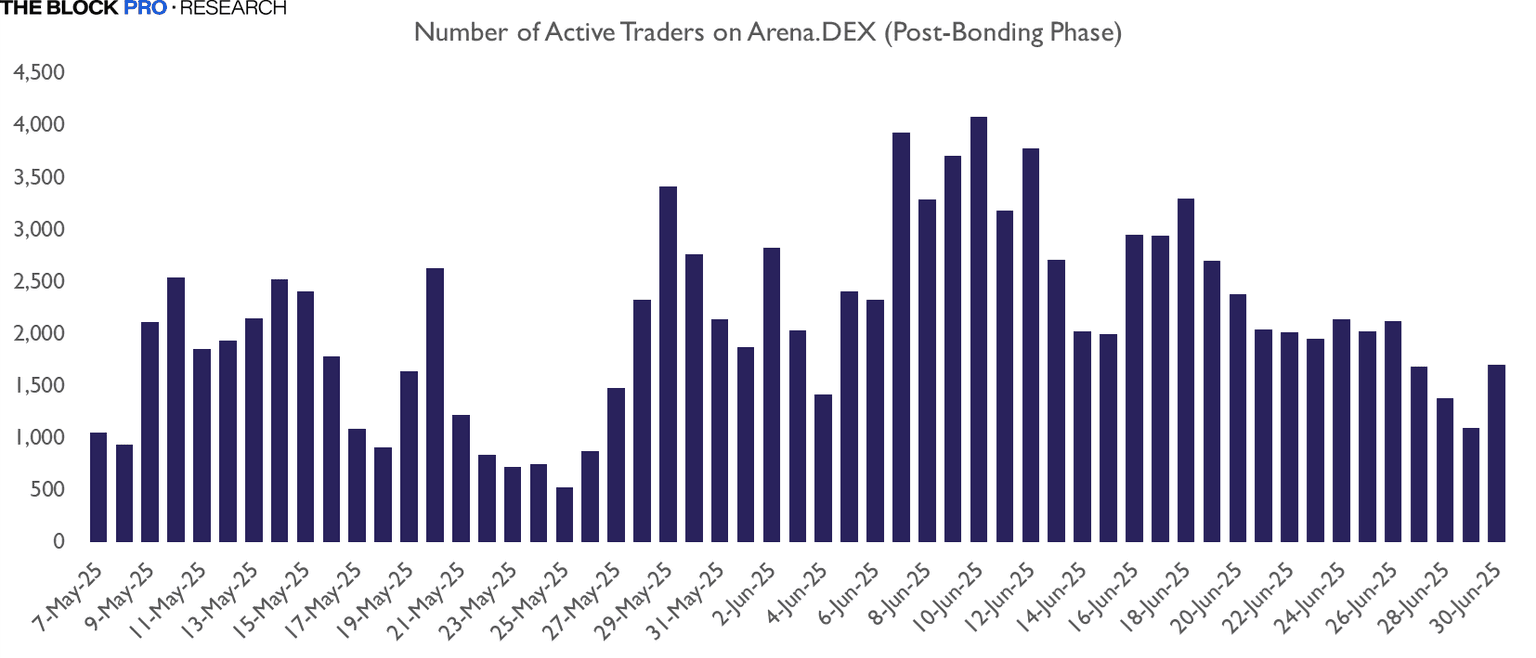 Arena’s on-chain exchange came out of the gate fast when it launched in early May 2025. In its first seven days, the DEX cleared ~4.1M over the subsequent seven-week period.