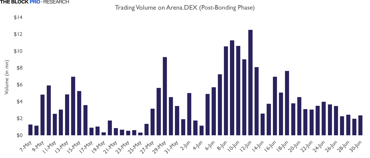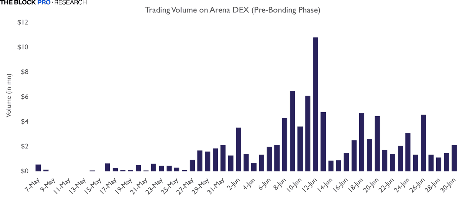 Arena.DEX has facilitated a total of 228M in post-bonding trading volume, with the platform’s busiest period occurring during the first two weeks of June, where it saw a total of over $141M in volume, or roughly 44% of the total.