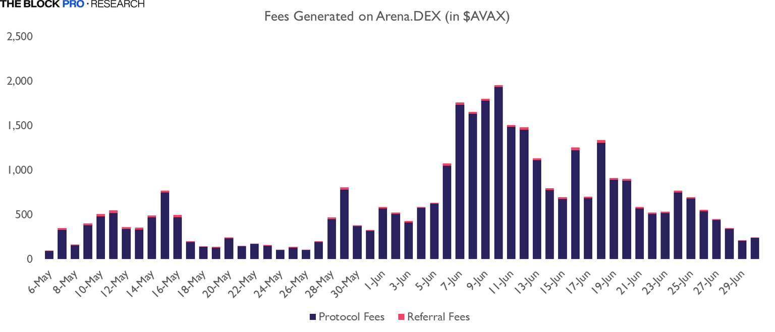 On the other hand, fee capture, denominated in AVAX, saw ~35K AVAX across the May 7 to June 30 window, with referral-link rebates accounting for just 2.6% of the total. That split implies most trading is organic rather than airdropped via referral farming, a relatively healthy sign for fee stickiness, despite the protocol’s nascency.