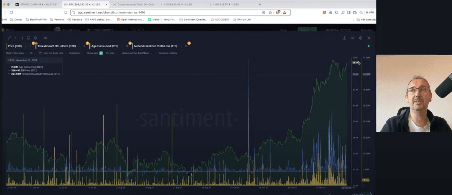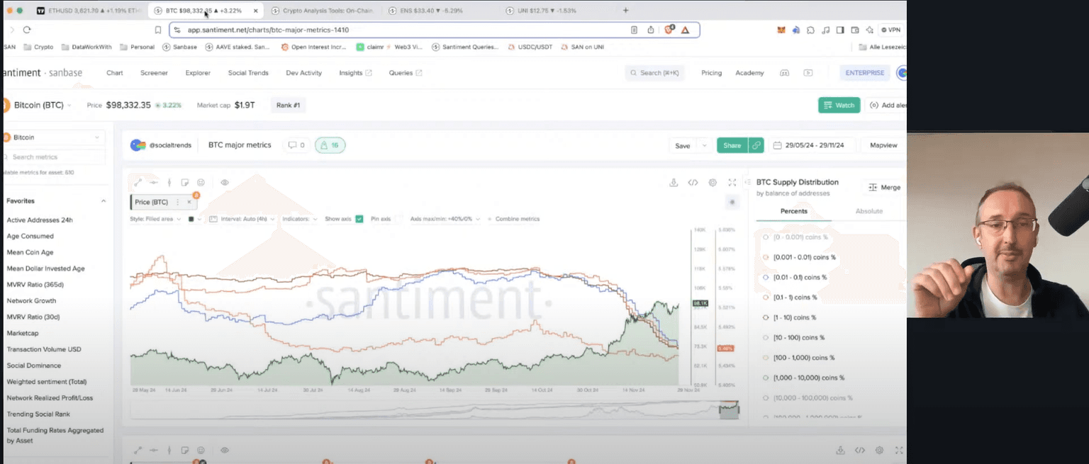 In this special Thanksgiving edition livestream, Maksim Balashevich, the founder of Santiment, shared a focused 15-minute market analysis. Using Santiment's data tools, he shared key insights about Bitcoin's price movements and the growing interest in altcoins. Let's break down the main points from his update.