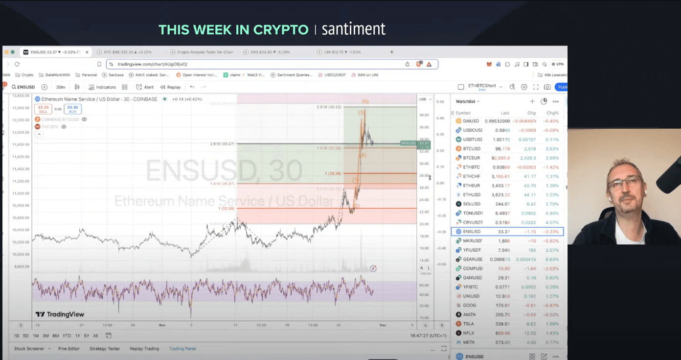The session concluded with an Elliott Wave analysis of both Bitcoin and ENS. For Bitcoin, Maksim suggested the possibility of one or two more tops in the current structure. ENS similarly showed potential for two more tops in its wave structure.