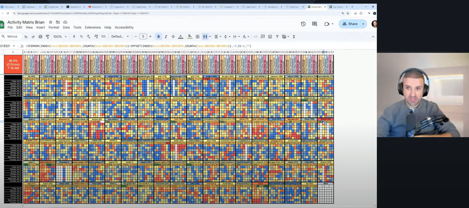 Brian provided a deep dive into the activity matrix, which shows that while Bitcoin activity has cooled down, Litecoinโs is super high, indicating a large amount of profit-taking. He also explained how to use the activity matrix to identify potentially underperforming assets that are suddenly experiencing increased network activity. This means looking for coins that are showing strong signs of turnaround activity and increased network traffic, but have not yet experienced price increases in comparison to the broader market. He suggests assets like Phala and Leo Dow as potential break-out candidates.