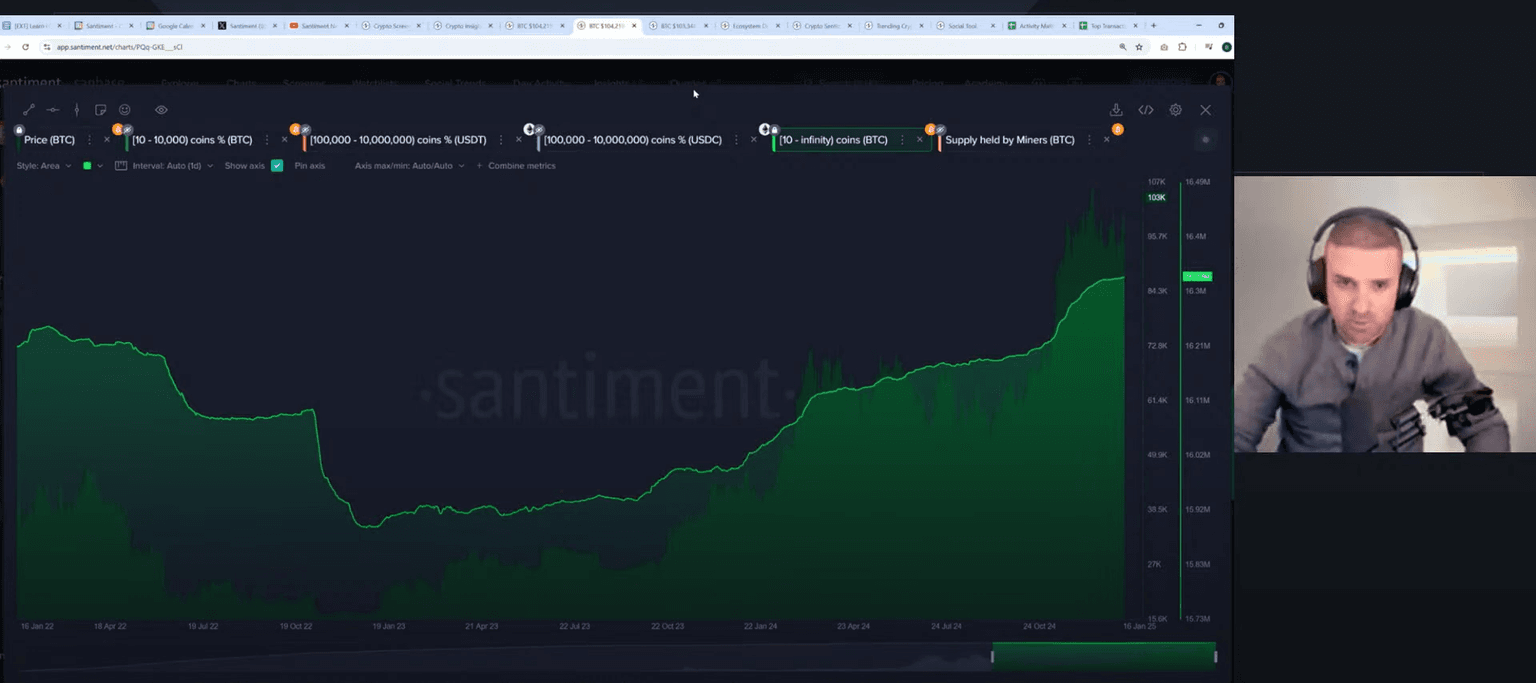 Brian highlighted that whale activity has significantly increased in the past 24 hours, with 10+ Bitcoin wallets adding another 1,49 BTC. Collectively, these wallets have added 126,000 more Bitcoin to their bags since the start of the bull rally three months ago. This continued accumulation from key stakeholders, such as the 10+ BTC wallet line, strongly correlates with price increases in the long term. Although short term prices may fluctuate, continuous growth in this metric is a signal that the market is moving in the right direction.